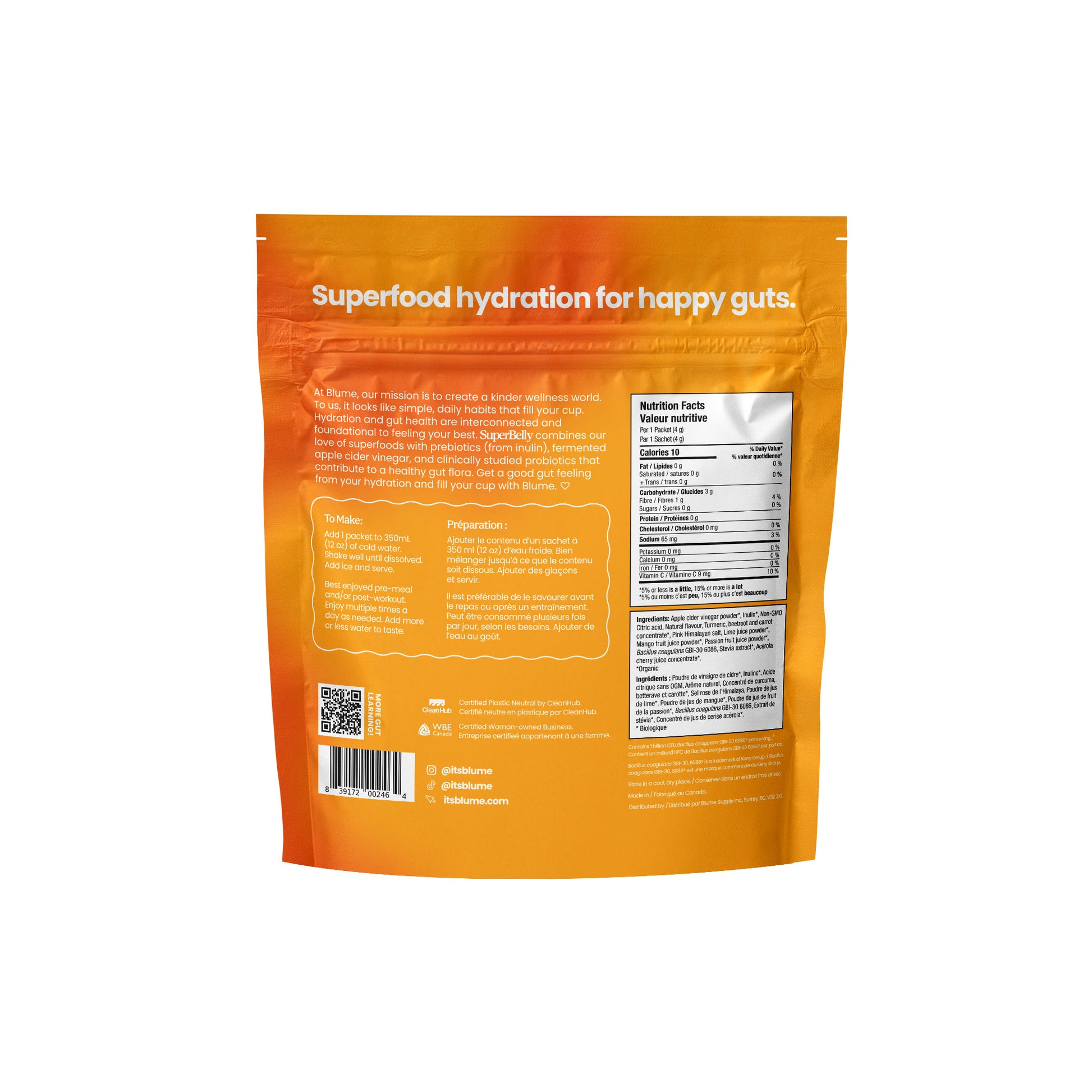 Apple cider vinegar powder*, Inulin*, Citric acid, Natural flavour*, Turmeric, beetroot and carrot concentrate*, Pink Himalayan salt, Lime juice powder*, Mango fruit juice powder*, Passion fruit juice powder*, Bacillus coagulans GBI-30 6086, Stevia extract*, Acerola cherry juice concentrate*. *Organic